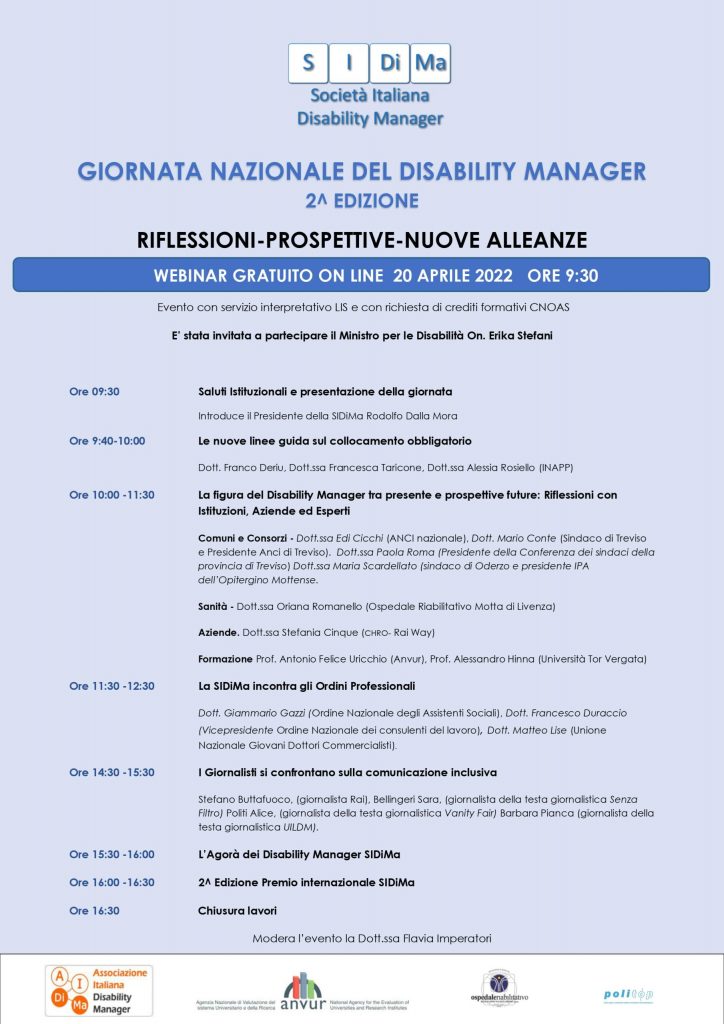 la Società Italiana Disability Manager (S.I.Di.Ma), anche quest’anno, in occasione della Giornata Nazionale del Disability Manager, giunta alla 2^ edizione, ha organizzato il webinar gratuito dal titolo “Riflessioni, Prospettive e Nuove Alleanze”, che si terrà in modalità online il prossimo 20 aprile.