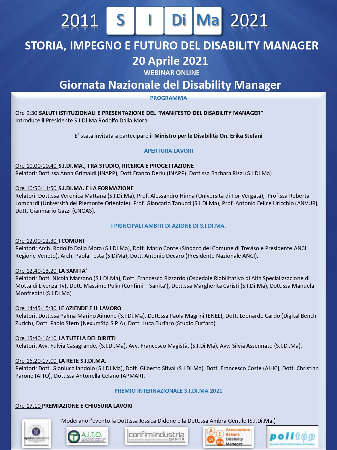 Martedì 20 Aprile 2021, in occasione dei dieci anni di attività della Società Italiana Disability Manager, si terrà il webinar organizzato da SIDiMa “2011 – 2021: Storia, Impegno e Futuro del Disability Manager”